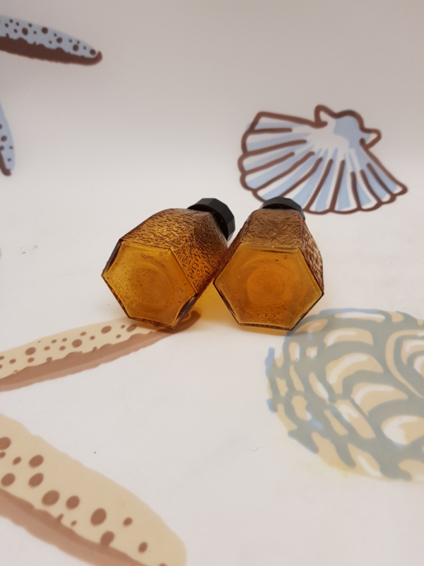 Vintages bruin gebobbeld glas met kunststof deksel(bakeliet?), 7.5cm hoog.