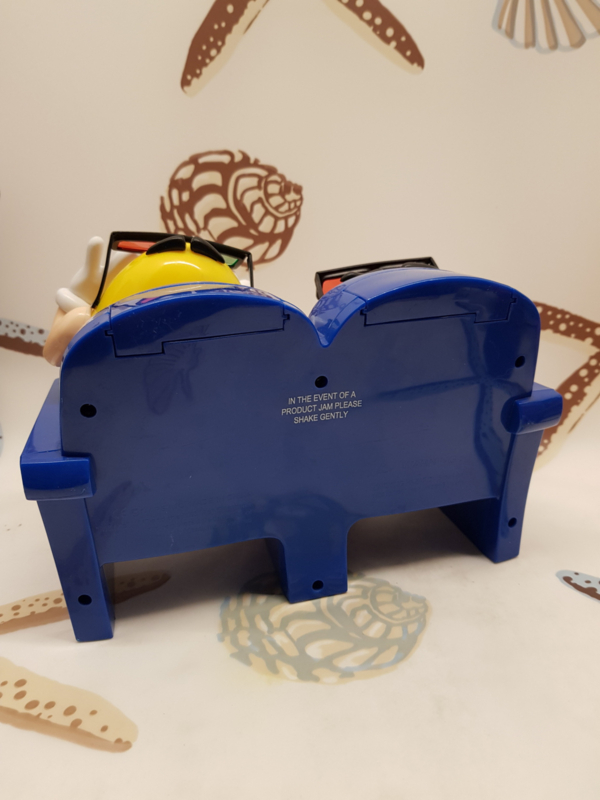 Leuke M&M dispenser in de vorm van 2 m&m's die in de bioscoop naar een enge film kijken, in mooie staat, 23x15cm.