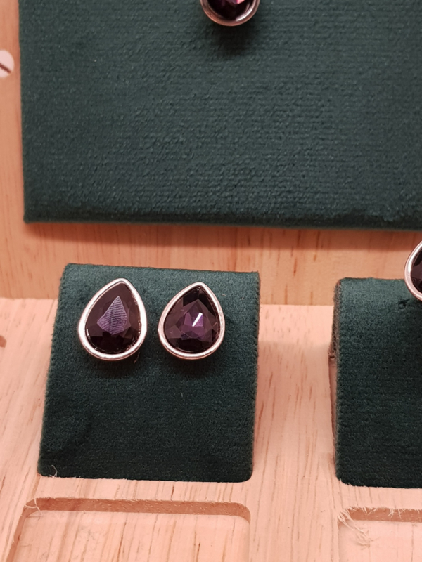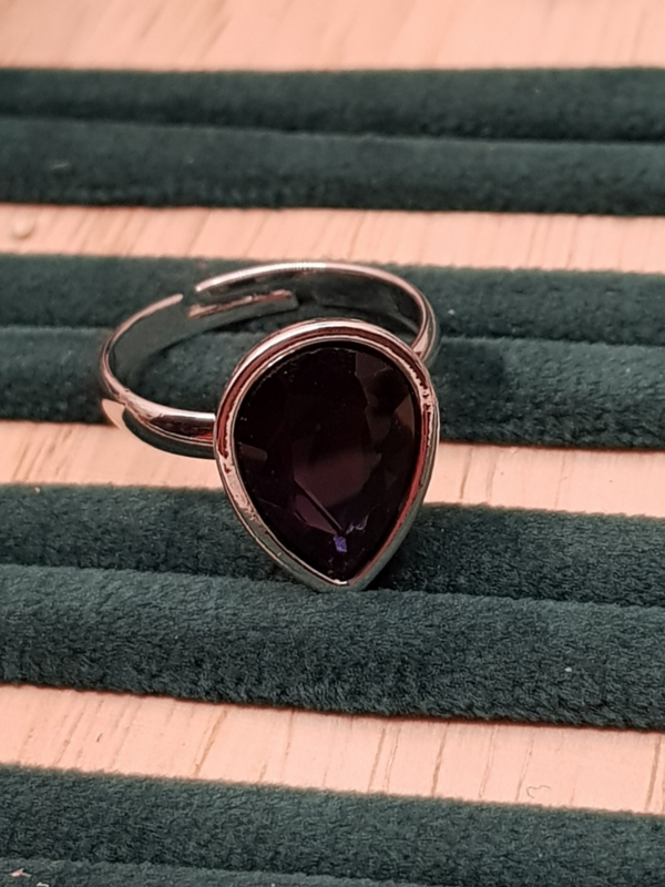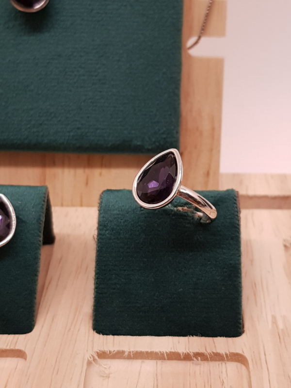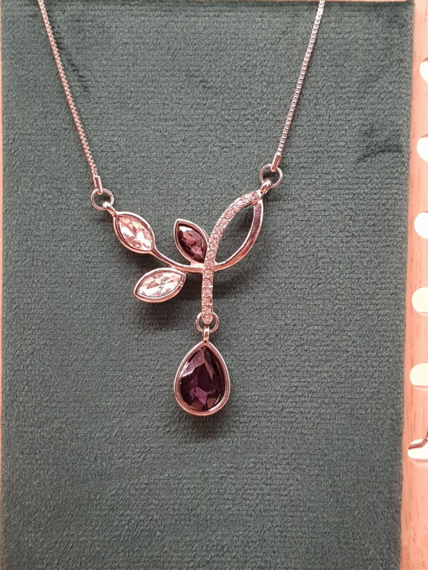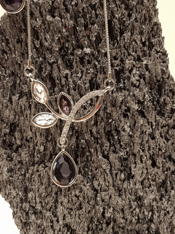 Ein wunderschönes Vintage-Schmuckset der Marke LBVYR. Die Halskette ist verstellbar und verfügt über einen Amethystimitat sowie kleine Kristalle, die Diamanten ähneln. Der Ring ist verstellbar und die Ohrringe sind zum Einstecken.