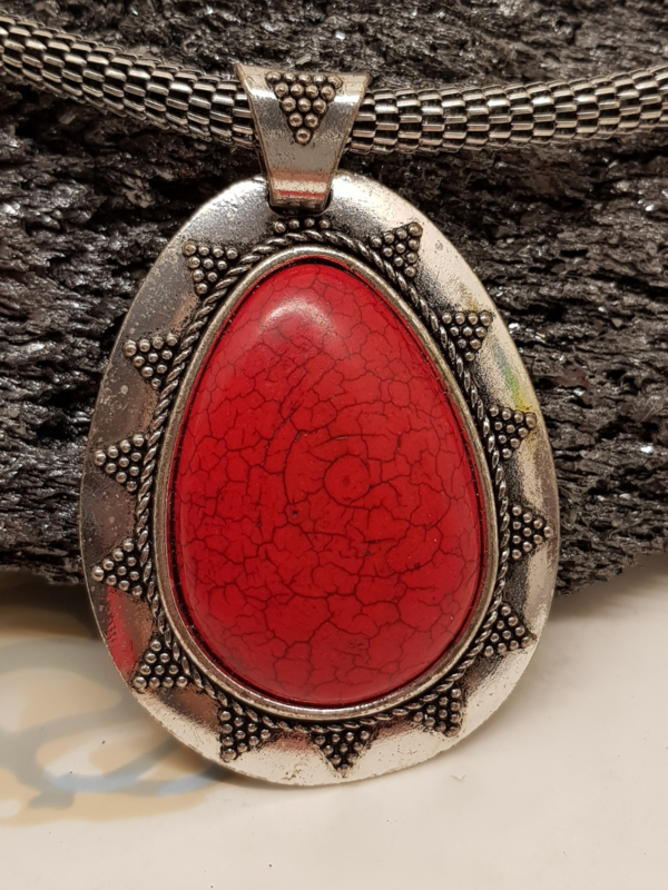Wunderschöne silberfarbene Vintage-Halskette aus den 90er Jahren mit rotem Amulett (9 x 7 cm), 45 cm.
