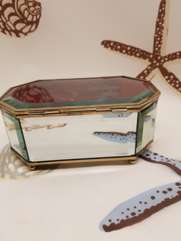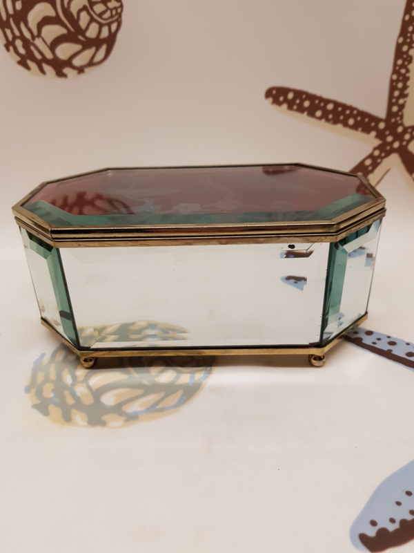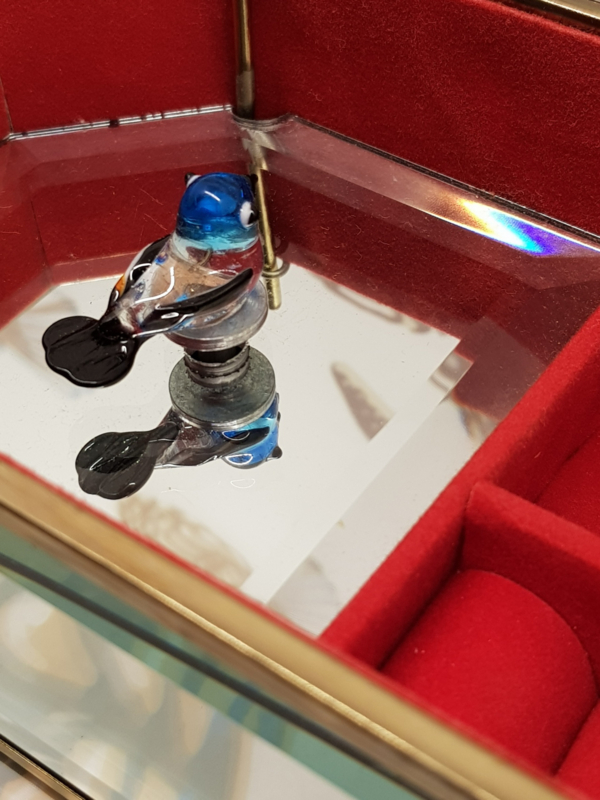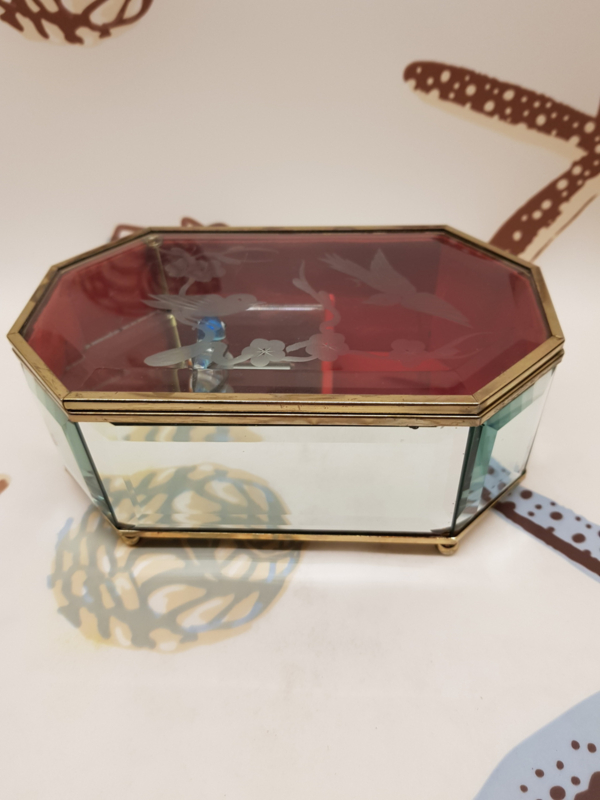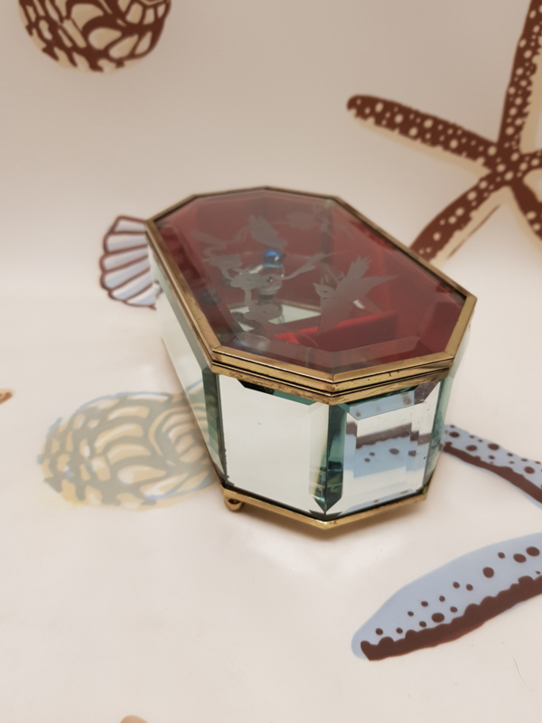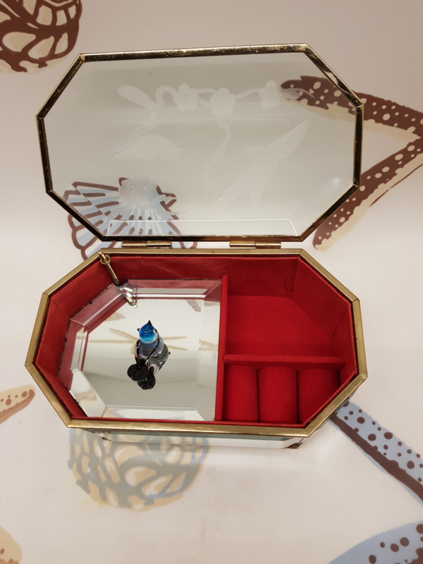 Wunderschöne Vintage-Spieluhr und Schmuckschatulle mit einem drehbaren, farbigen Glasvogel, komplett aus Glas gefertigt mit graviertem Glas und Spiegeln, 18,5 x 11 x 8 cm.