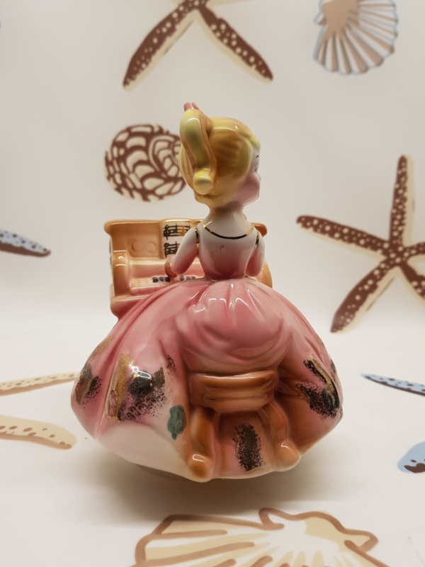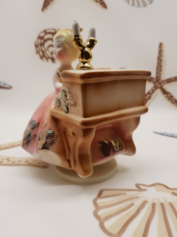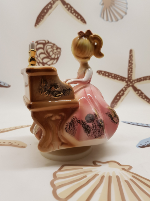 Wunderschöne Vintage-Spieldose mit einer Porzellanfigur einer Dame hinter dem Klavier, die sich zur Musik umdreht; 16 cm hoch.