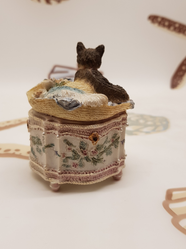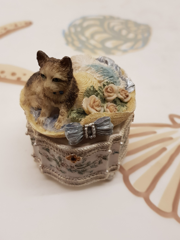 Vintage kleine Spieldose mit Katzenmotiv, leider funktioniert sie nicht, 9 cm hoch.