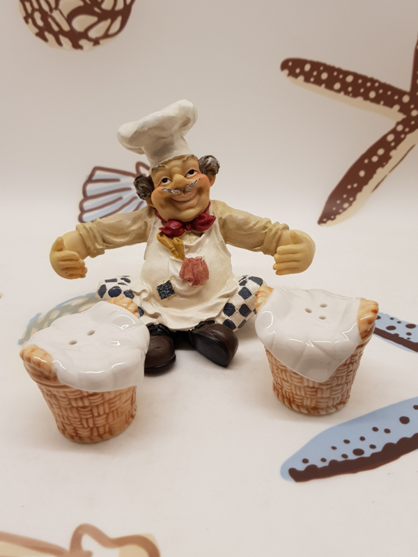 Schöner Polystone-Kochtopf mit 2 Körben, die als Pfeffer- und Salzstreuer dienen, 13,5 cm breit und 11 cm hoch.