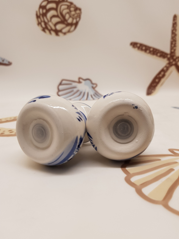 Blaue und weiße Porzellankugeln mit Windmühlenmotiv, Durchmesser 5 cm, Höhe 6 cm.