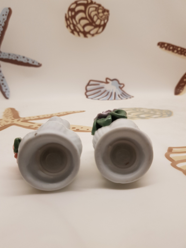 Zwei sehr alte Salz- und Pfefferstreuer aus Porzellan mit einer schönen Blume auf der Vorderseite, 8 cm hoch.