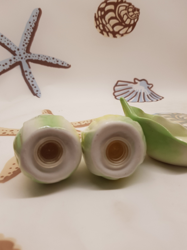Porzellanmaiskolben auf einem Bambusboot, Gesamtbreite 18 cm, Höhe 12 cm.