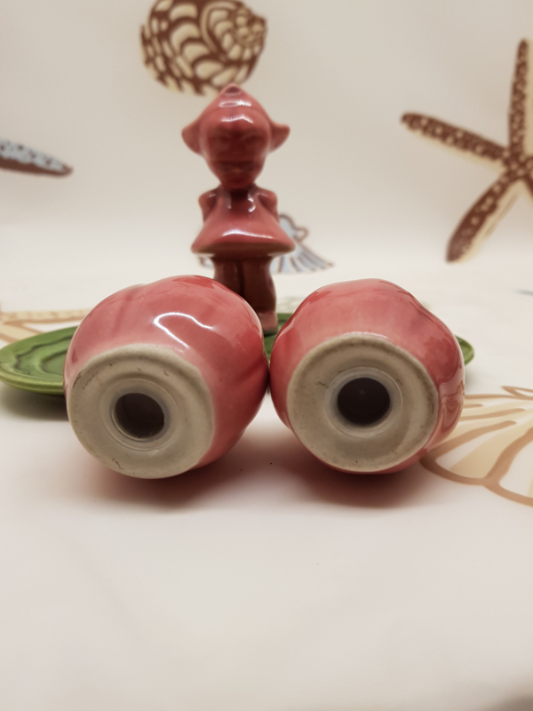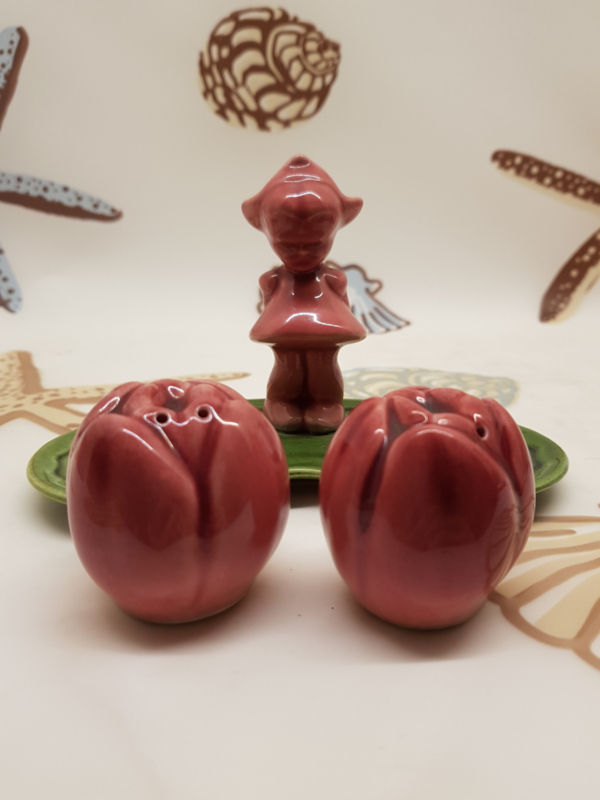 Mädchen mit 2 Tulpen vor sich als Salz- und Pfefferstreuer, sehr schön, B 16 cm, H 10 cm.