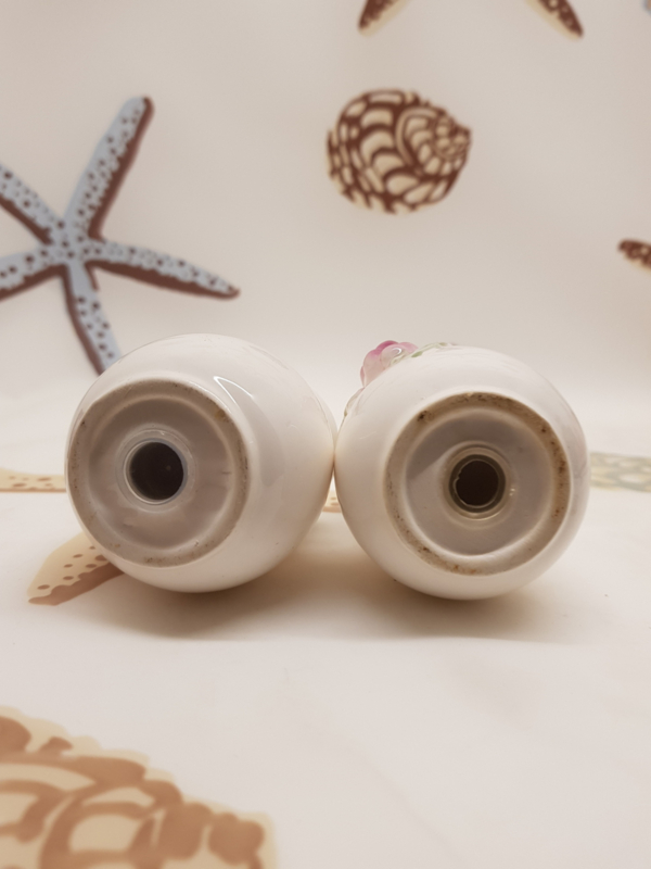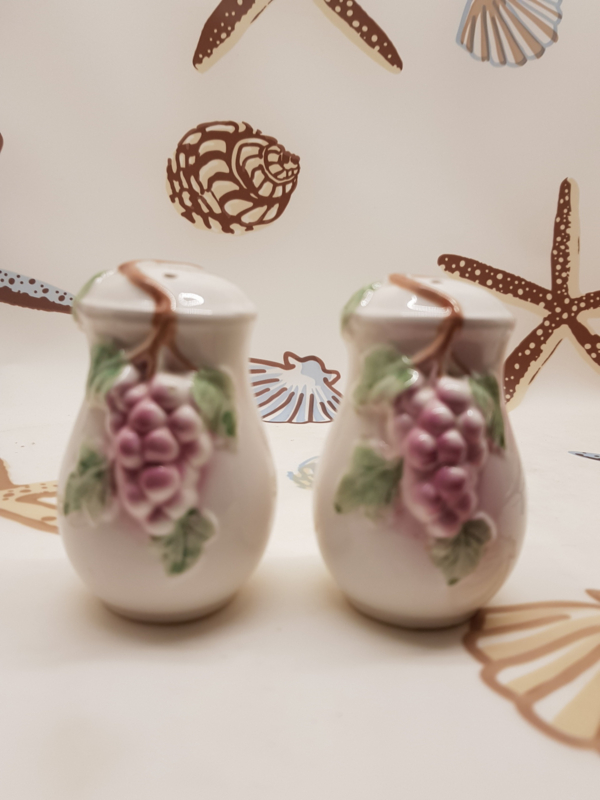 Hübsche Vintage-Salz- und Pfefferstreuer in Vasen mit Weinreben, 9,5 cm hoch.