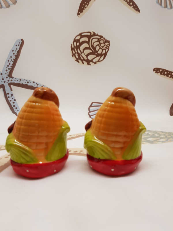 Porzellanförmige, lächelnde Maiskolben als Salz- und Pfefferstreuer, 8 cm hoch.