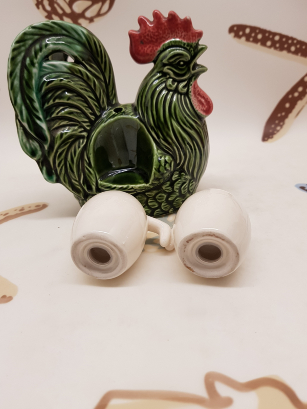 Großes Huhn als Halter für die Eier in dem Gestell, das als Salz und Pfeffer dient, 1970er Jahre, 13 cm hoch.