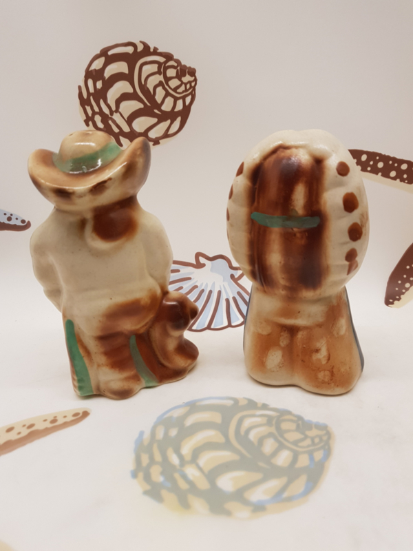 Salz- und Pfefferstreuer aus Porzellan im Cowboy- und Indianer-Stil aus den 1970er Jahren, der höchste ist 15 cm hoch.