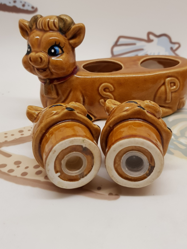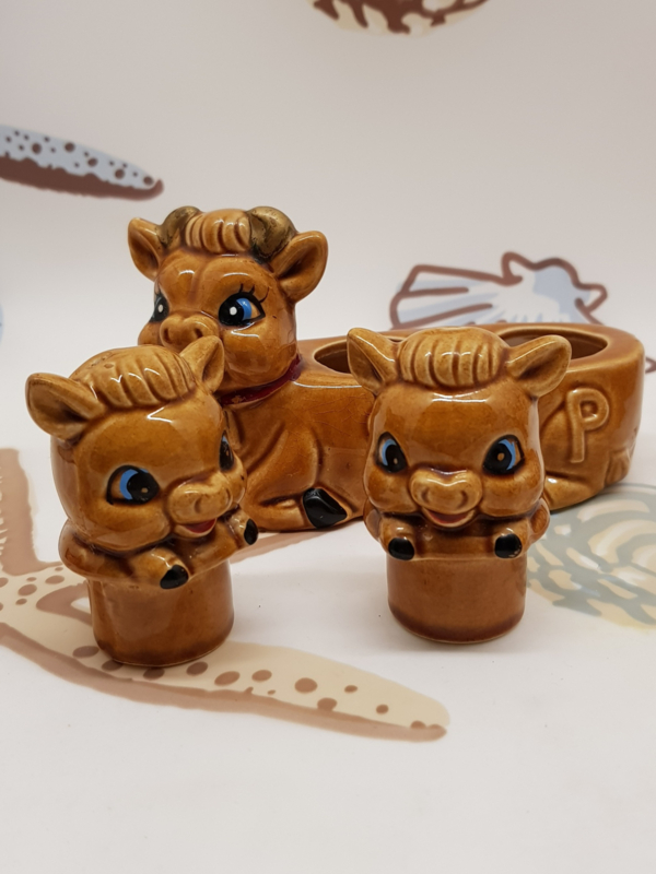 Wunderschöne Salz- und Pfefferstreuer aus den 1970er Jahren, eine Kuh mit ihrem Kalb, Keramik, 13x9cm.