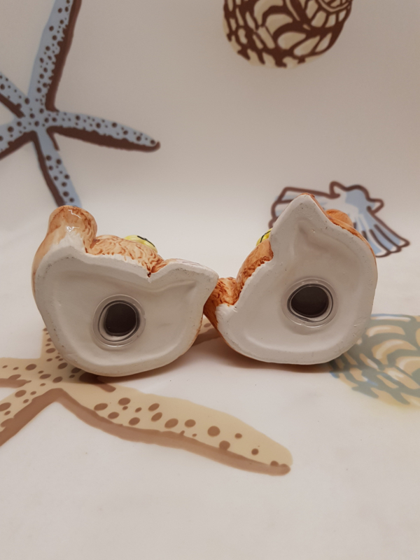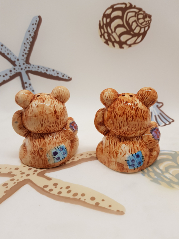 Stoffbären aus den 70er Jahren als Salz- und Pfefferstreuer, Höhe 9 cm.
