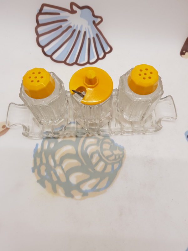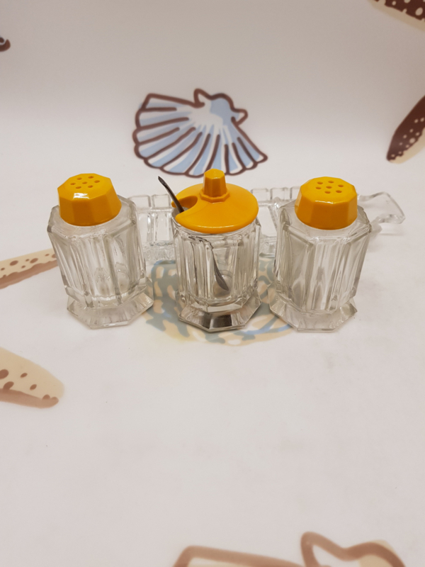 Vintage-Gläserset, 4-teilig, Pfeffer-, Salz-, Milchgläser und Schüssel mit Löffel und Plastikkappen, aus der Tschechoslowakei, 18 x 7,5 cm.