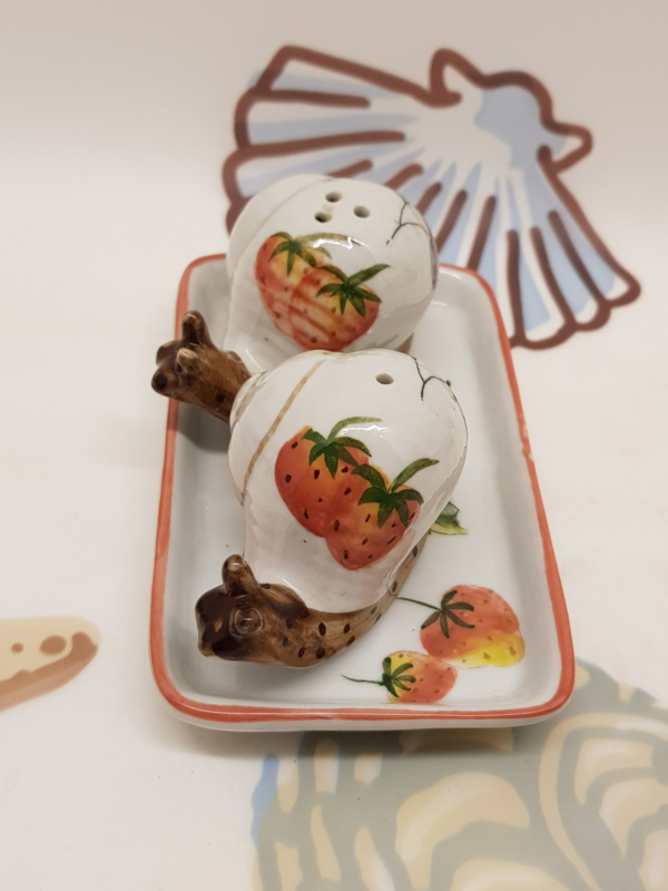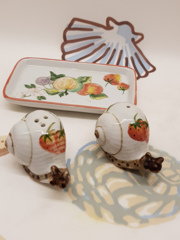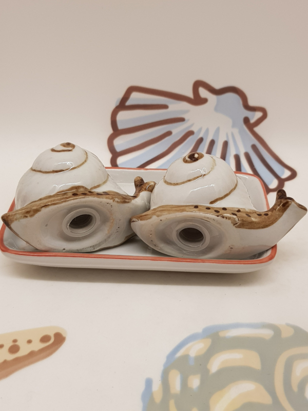Schönes Keramik-Schnecken-Set als Salz- und Pfefferstreuer, mit Schale, 11 x 5 cm (Höhe).