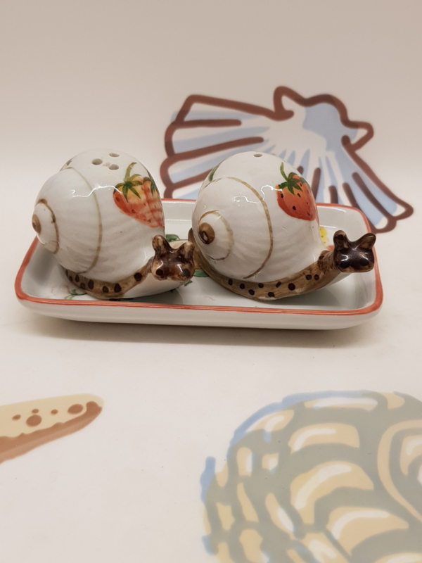 Schnecken auf einem Tablett als Salz- und Pfefferstreuer