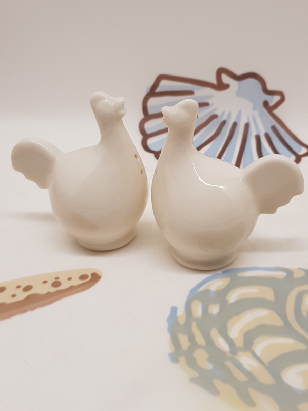 Kleine Porzellanhühner als Salz- und Pfefferstreuer, Höhe 7,5 cm.