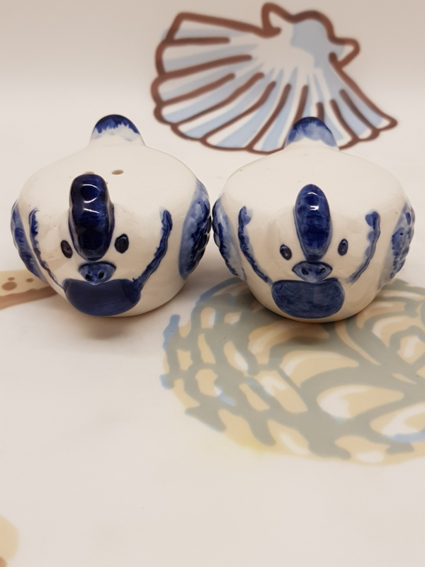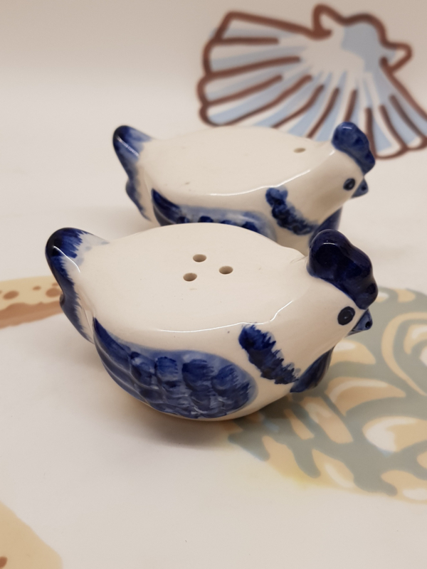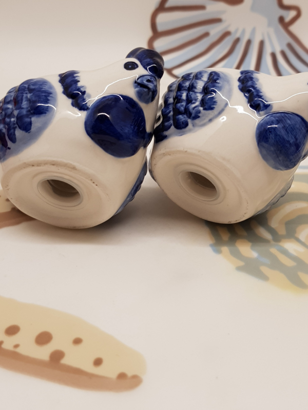 Hübsche Porzellanhühner mit flachem Rücken, blau-weiß, 4,5 cm hoch.