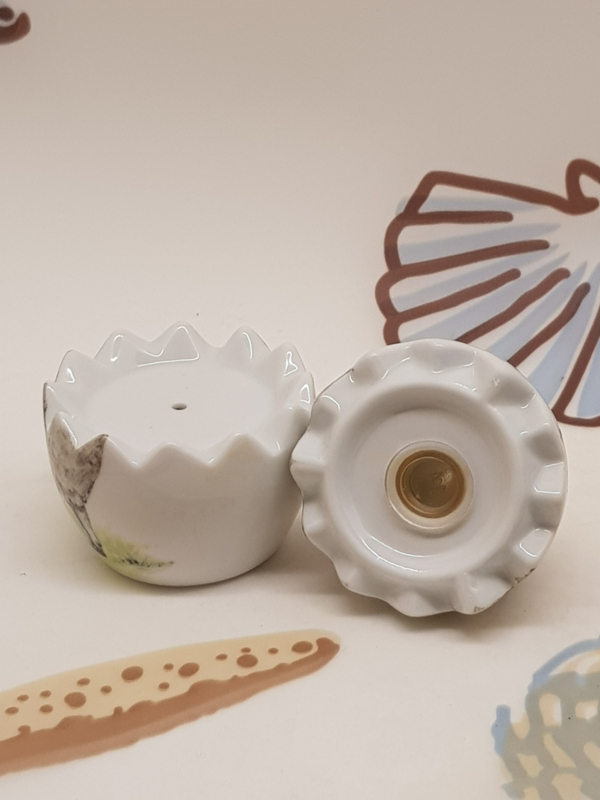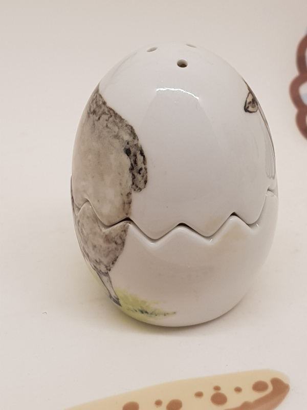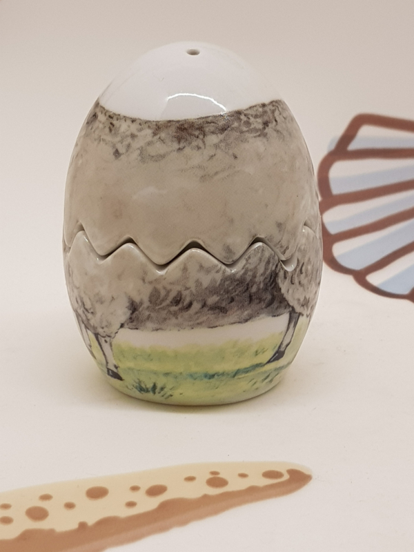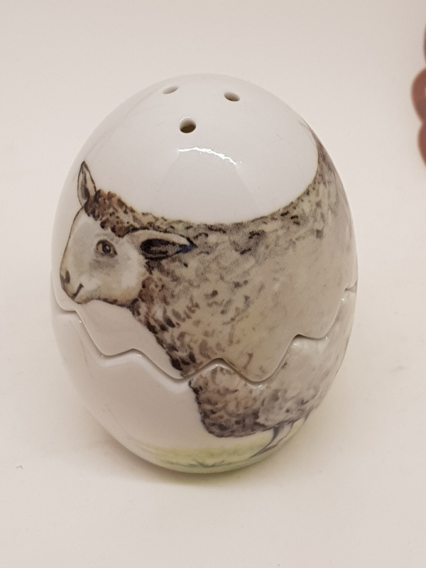 Großes Ei mit dem Bild eines Schafes als Salz- und Pfefferstreuer, 7 cm hoch.