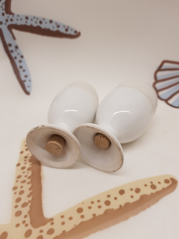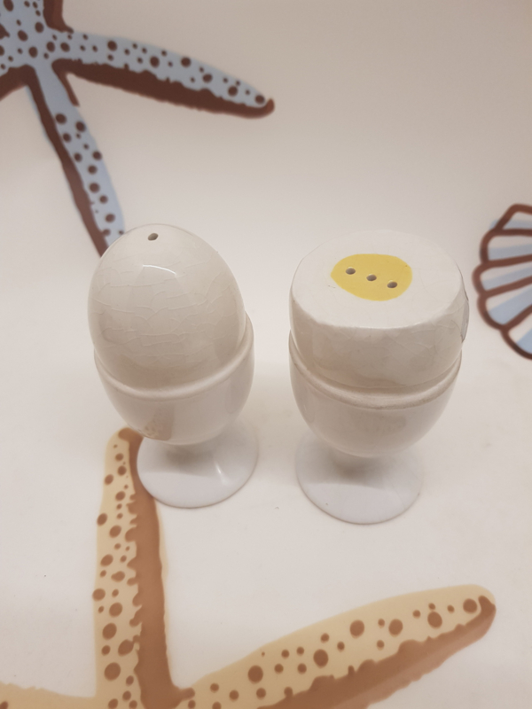 Geschältes Ei und Ei im Eierbecher, wie Pfeffer und Salz, altersbedingt stark rissiges Porzellan, 10 cm hoch.