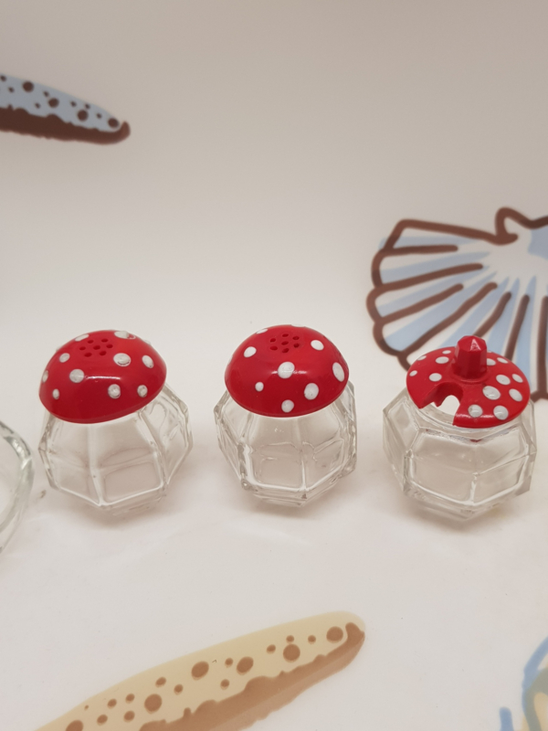 Wunderschönes Vintage-Glas-Set, Pilze als Pfeffer-, Salz- und Milchbehälter, die roten Deckel sind ebenfalls aus Glas, bei einem fehlt innen ein kleines Stück, aber es lässt sich trotzdem schließen.