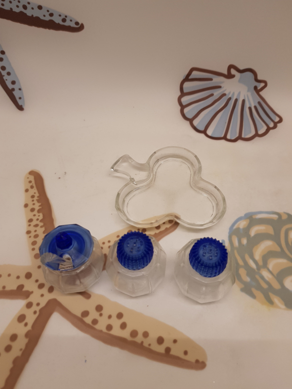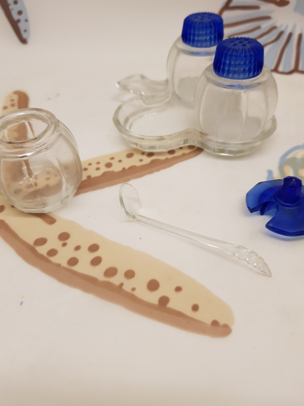 Schönes Vintage-Glas-Set, 3-teilig auf einem Kleeblattteller, Pfeffer, Salz und Milch mit Löffel, 6 cm hoch.