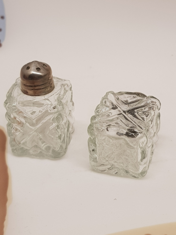 Hübsche kleine quadratische Glasfläschchen für Pfeffer und Salz, Verschlüsse aus Metall (nicht Eisen), 2,7 x 2,7 x 4,5 cm hoch.