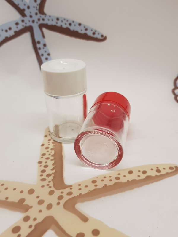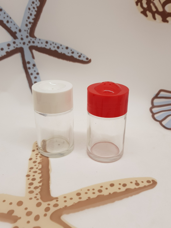 Schöne Vintage-Salz- und Pfefferstreuer aus Glas mit Kunststoffkappe, 8 cm hoch, Durchmesser 4 cm.