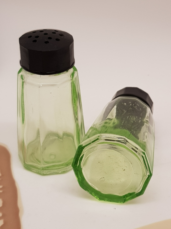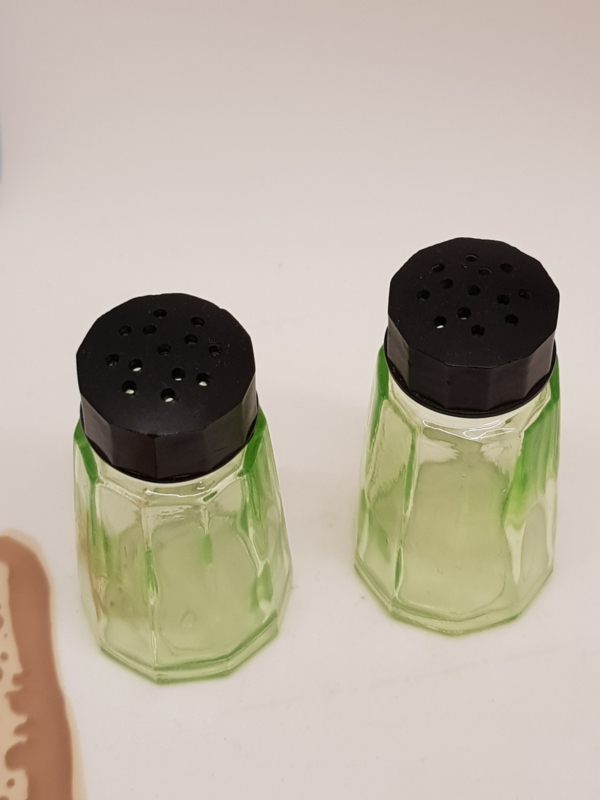 Antike Salz- und Pfefferstreuer, urangrünes Glas mit Kunststoffkappe (Bakelit?), 7 cm hoch.