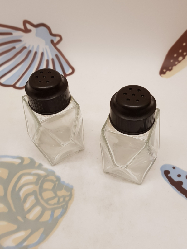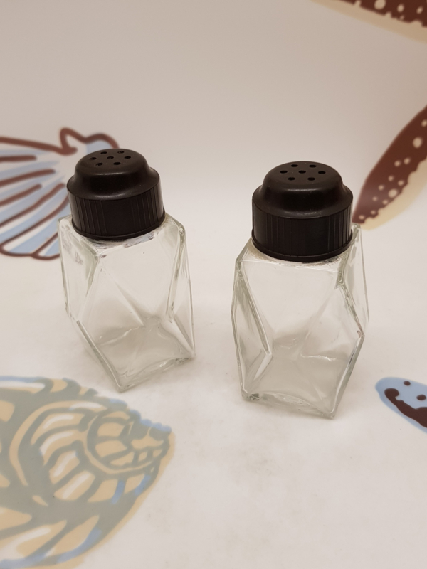 Antikes, formschönes Pfeffer- und Salzset aus Glas mit Kunststoffkappe (Bakelit?), 8 cm hoch.