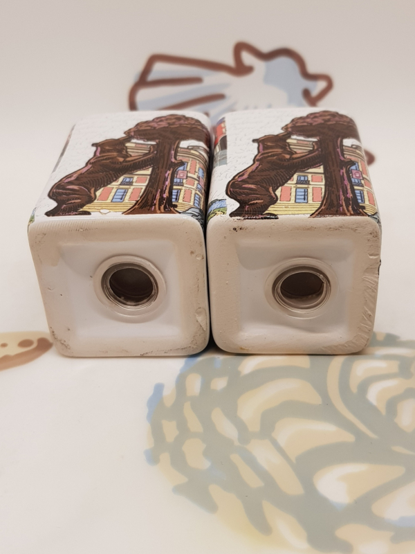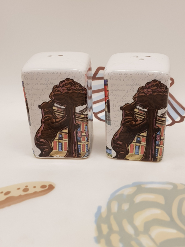 Schöne Salz- und Pfefferstreuer, als Souvenir aus Madrid mitgebracht, Steingut, 4,5 x 4,5 x 7 cm hoch.