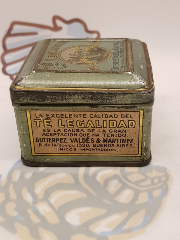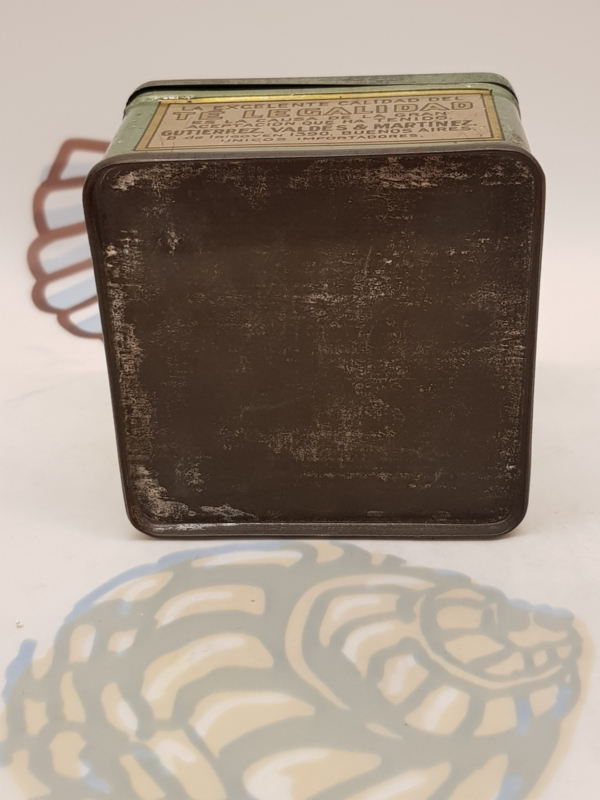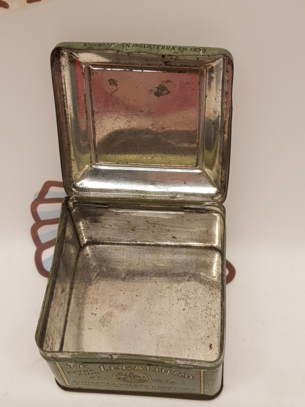Antike spanische Teedose aus dem Jahr 1930, Marke Te Legalidad, in sehr gebrauchtem Zustand, 7,5 x 7,5 x 5,5 cm.