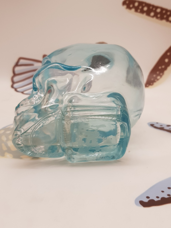 Wunderschöner blauer Totenkopf aus dickem Glas mit Stöpsel, ideal zum Servieren von Getränken.