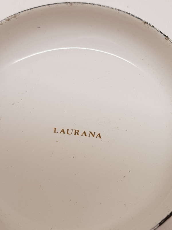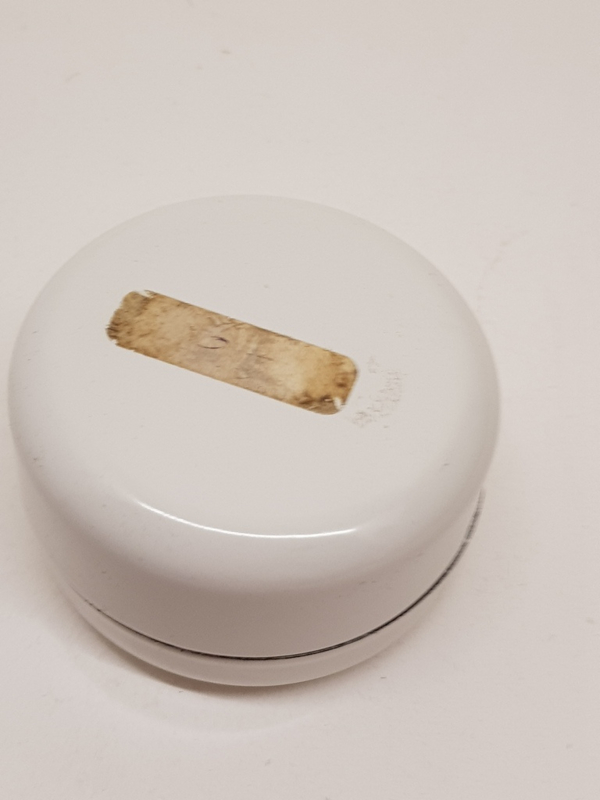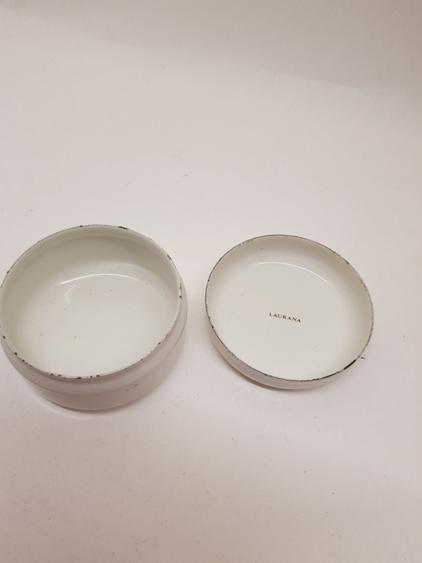 Brocant-Emailleglas mit Deckel mit dem Bild von Pierrot, ø7cm, H.4cm, in gutem Zustand, nur einige Chips an den Rändern.