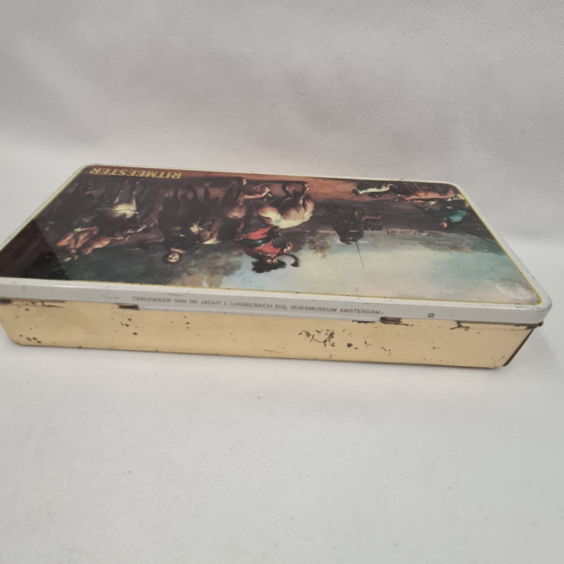 Sehr alte Dose von Ritmeester 50 Zigarren Nr. 777 mit einem Bild der Rückkehr der Yacht J. Lingelbach Rijksmuseum Amsterdam, 22x11x3,5 cm.