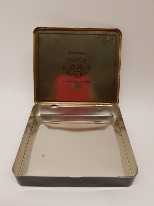 Schöne Vintage-Dose von La Paz Tabacos Primeros Cherie, in ordentlichem alten Zustand, 12,5 x 11 x 2,5 cm.