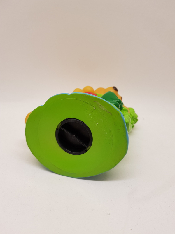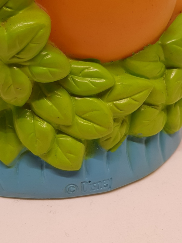 Schöne Vintage Disney Spardose aus Plastik, Winnie The Pooh spielt mit einem Frosch, sehr guter Zustand, nur der Boden ist etwas verschmutzt, 15 cm hoch.