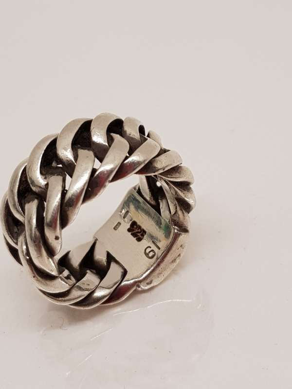 Ein grober Herrenring aus zweiter Hand von Buddha to Buddha mit Originaletui, Größe 19 Silber, Ringbreite 1,3 cm.