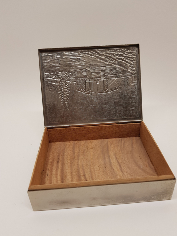 Schöne Vintage-Holzkiste mit silberfarbenem Gehäuse, diese stand früher mit Zigaretten darin auf dem Tisch, schönes Bild einer Zugbrücke, 13x10x3,2cm.