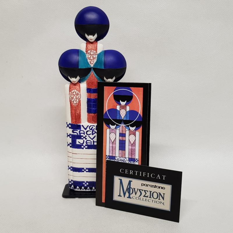 Während der Jahrhundertwende wurde die Wiener Sezession 1897 von einer Gruppe um Moser, Hoffmann und Klimt gegründet. Es handelte sich buchstäblich um eine Sezession (Abspaltung) vom traditionellen Wiener Künstlerhaus. Die meist jungen Künstler suchten nach ihrer eigenen Variante des Jugendstils, wie es auch andere in München und Berlin getan hatten. Aus der Wiener Sezession ging 1903 die Wiener Werkstätte hervor, eine Produktionsgemeinschaft für angewandte Kunst, die die bildende und angewandte Kunst miteinander in Einklang bringen wollte. Neu im Karton mit Zertifikat, 20 cm hoch.