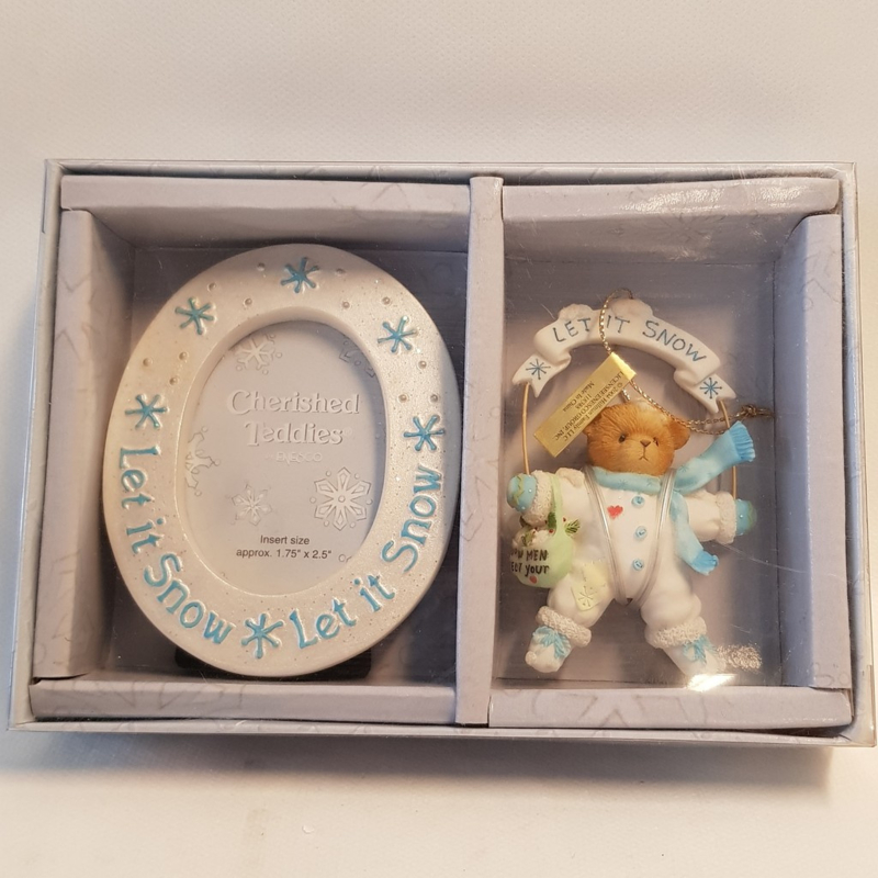 Fotorahmen und hängende Verzierung lassen ist Schnee 118388Cherished Teddies, Hillman-Familie, herausgegeben von Enesco im Jahr 2004, neu in der Schachtel, kleine Flecken auf der Rückseite der Schachtel.