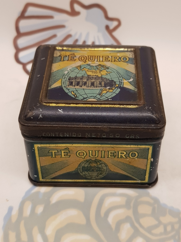 Teedose Spanisch Antik Te QuieroAntike spanische runde Teedose aus dem Jahr 1930, Modell Te Quiero, in sehr gebrauchtem Zustand, 7,5 x 7,5 x 5,5 cm.