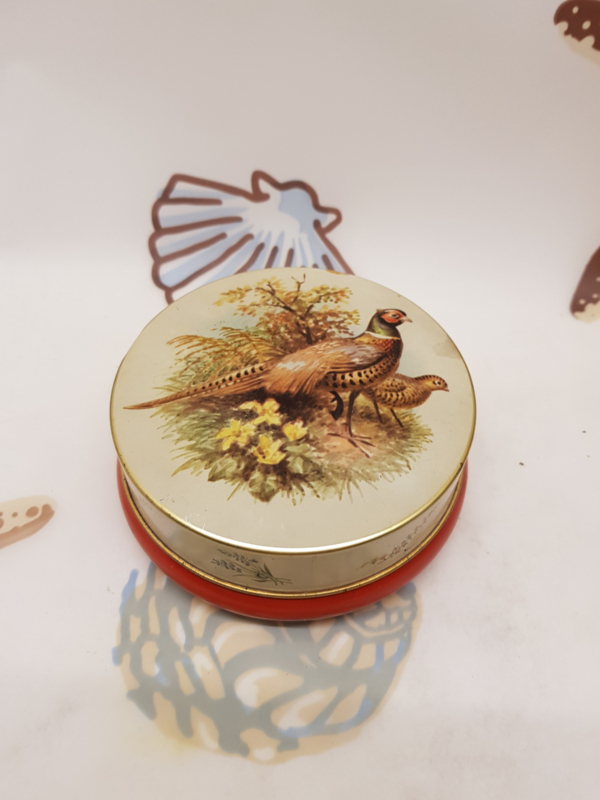 Alte viktorianische Dose mit FasanWunderschöne, alte Vintage-Dose für Kekse oder Toffees, die originale Papiereinlage ist noch vorhanden, ø12cm, 5cm hoch, weist Dellen auf.