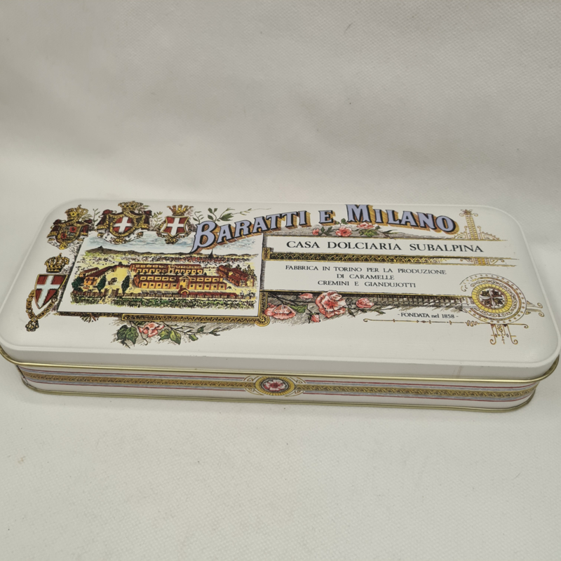 Baratti E Milano schöne alte DoseBaratti E Milano Casa Dolciaria Subalpina, ordentlicher Zustand, 27,5 x 11,5 x 4 cm.