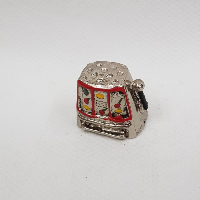 Metallkausche in Form eines SpielautomatenSchön für den Sammler, ein Fingerhut in Form eines Spielautomaten, 1,5x2,2x2,5 cm.
