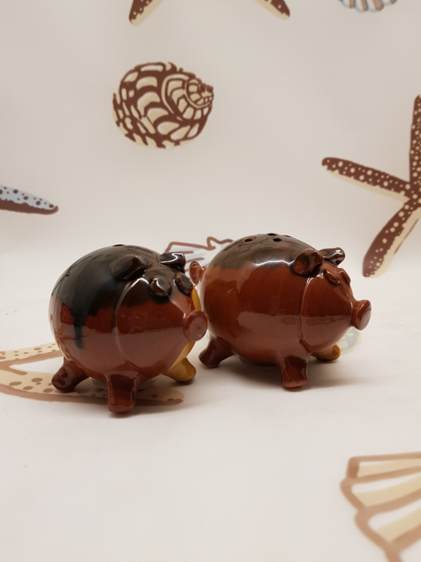 Salz und Pfeffer Freche SchweinchenNiedliche, freche Vintage-Schweinchen als Salz- und Pfefferstreuer, zusammen 11,5 x 7,5 cm hoch.
