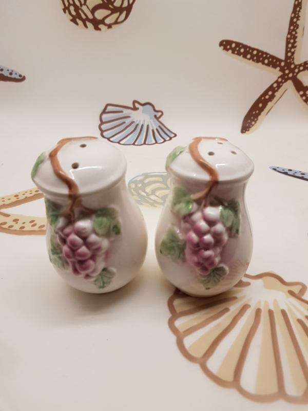 Salz- und Pfeffervasen mit WeinzweigHübsche Vintage-Salz- und Pfefferstreuer in Vasen mit Weinreben, 9,5 cm hoch.