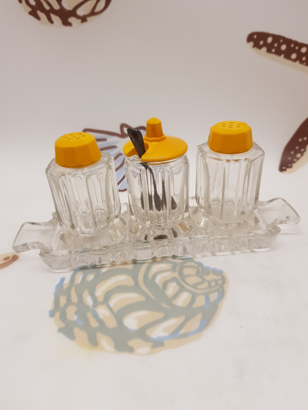 Vintage Salz- und Pfefferstreuer aus den 70er Jahren, 4 StückVintage-Gläserset, 4-teilig, Pfeffer-, Salz-, Milchgläser und Schüssel mit Löffel und Plastikkappen, aus der Tschechoslowakei, 18 x 7,5 cm.