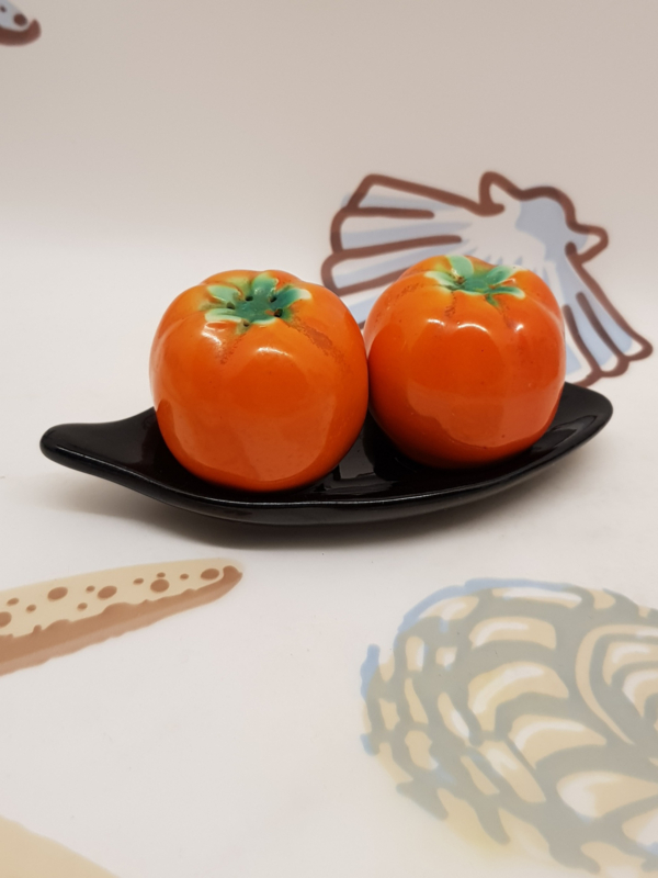 Salz- und Pfefferstreuer aus Keramik mit ZitrusmotivenHübsche Salz- und Pfefferstreuer in Form von Zitrusfrüchten aus den 70er Jahren, 7,5 cm hoch.